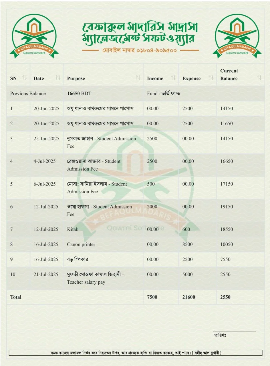 - অনুষ্ঠান ও মাহফিল: প্রতিষ্ঠানের বিশেষ অনুষ্ঠান বা মাহফিলের জন্য আলাদা জমা এবং খরচের হিসাব ব্যবস্থাপনা।